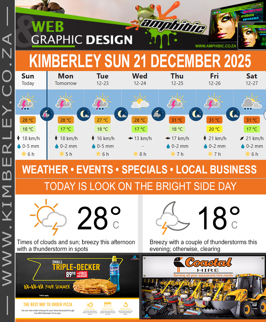 #KimberleyToday, Sunday 21/12/2025 https://www.kimberley.org.za/?p=42604 TODAY’S WEATHER, EVENTS, SPECIALS & PROMOTIONS __________________________________________ KIMBERLEY’s #WEATHERTODAY ...