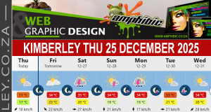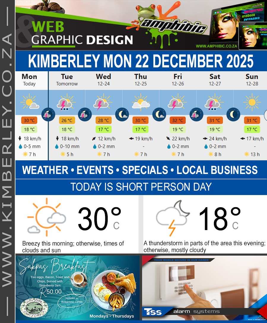#KimberleyToday, Monday 22/12/2025 https://www.kimberley.org.za/?p=42609 TODAY’S WEATHER, EVENTS, SPECIALS & PROMOTIONS __________________________________________ KIMBERLEY’s #WEATHERTODAY ...