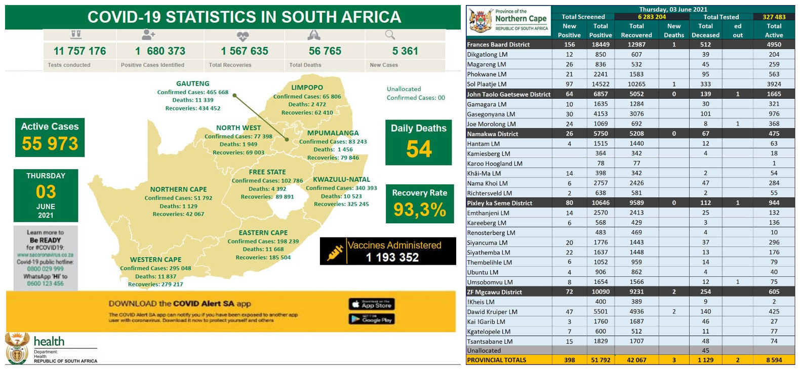 NORTHERN CAPE COVID-19 STATISTICS AS AT 03 JUNE 2021