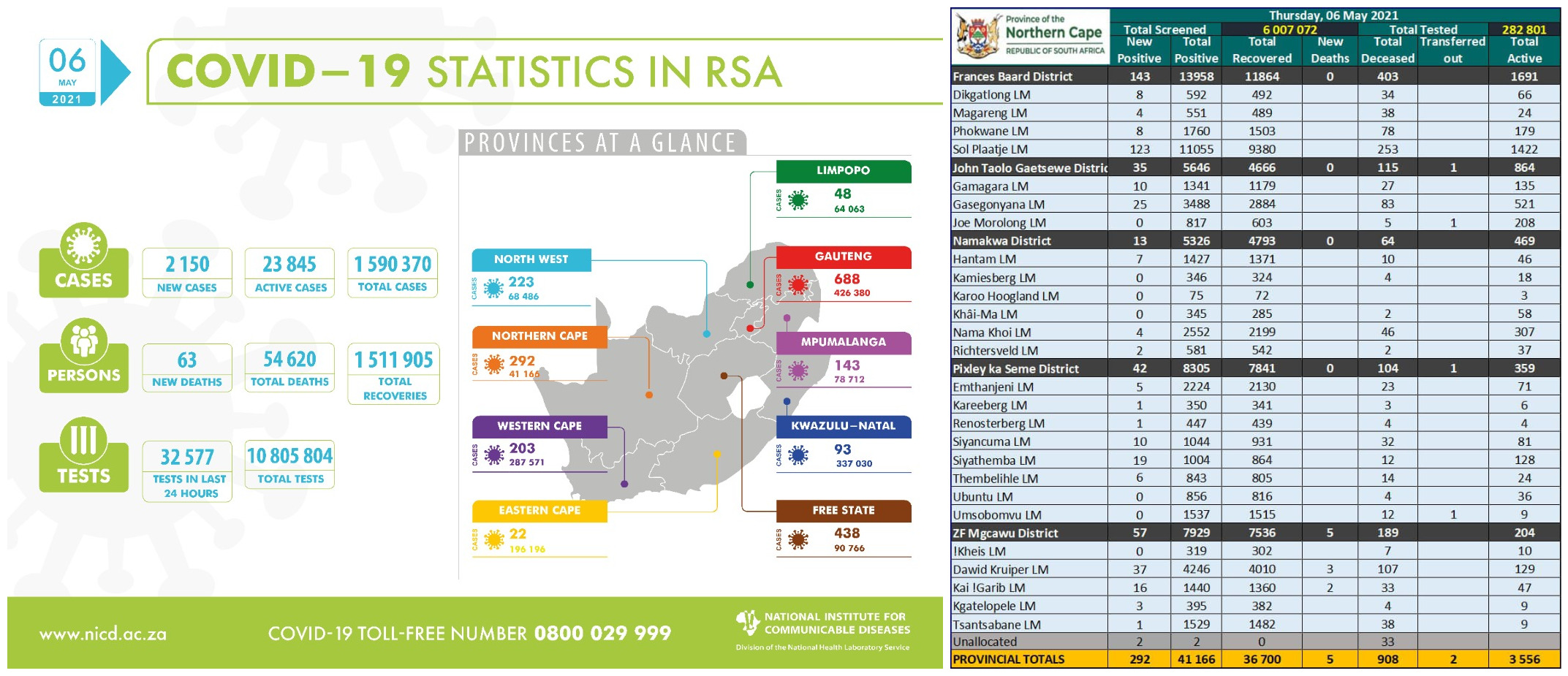 NORTHERN CAPE COVID-19 STATISTICS AS AT 06 May 2021