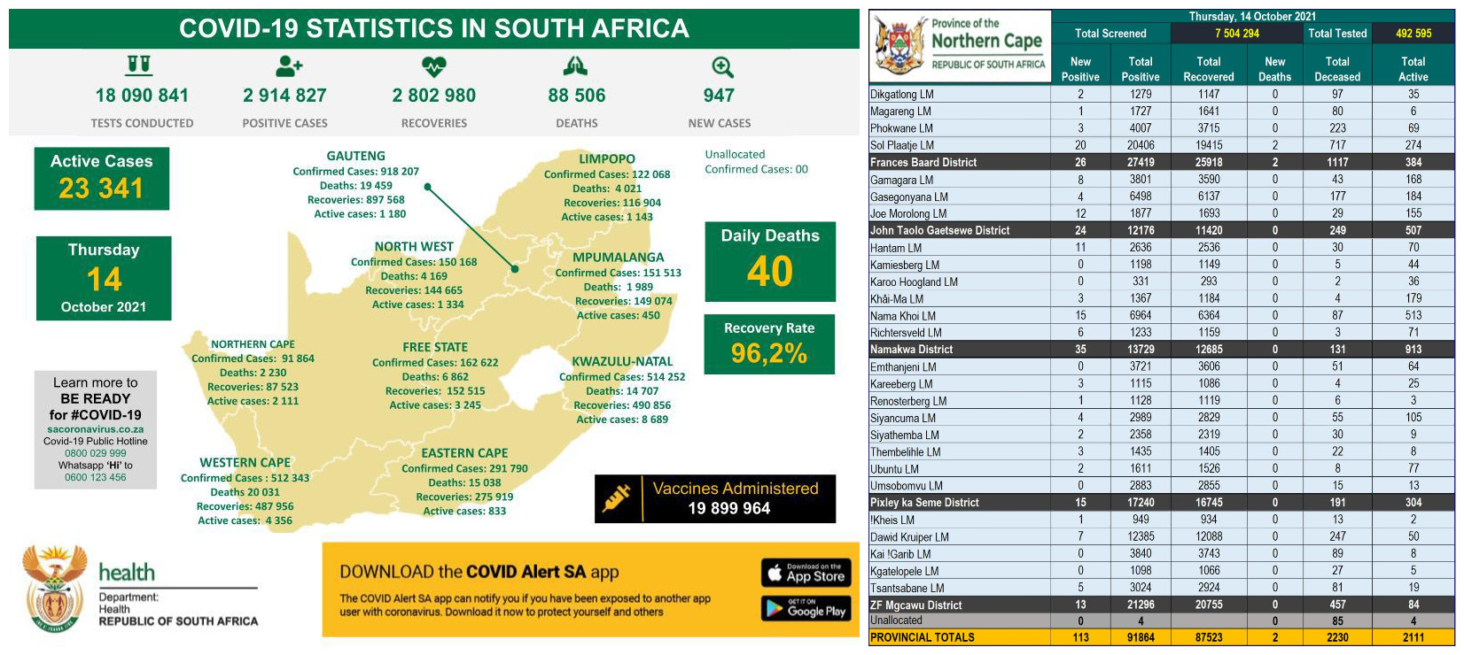 NORTHERN CAPE COVID-19 STATISTICS AS AT 14 OCTOBER 2021