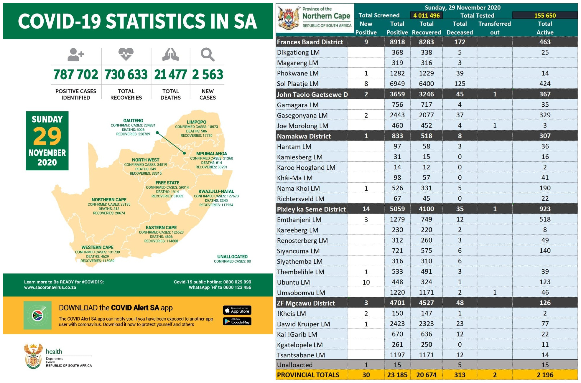 As of today (29 Nov 2020), the cumulative total of COVID-19 cases is 787 702 with 2 563 new cases identified since the last report.
