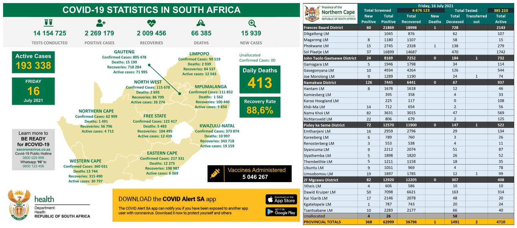 NORTHERN CAPE COVID-19 STATISTICS AS AT 16 JULY 2021