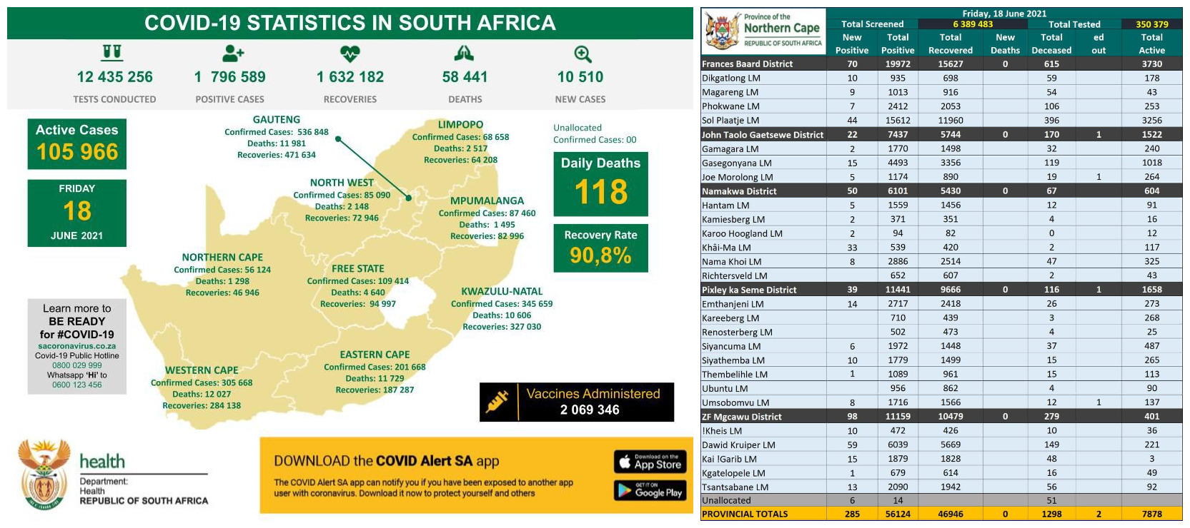 As of today (18 June 2021), The National Institute for Communicable Diseases (NICD), a division of the National Health Laboratory Service, reports that 10,510 new COVID-19 cases have been identified in South Africa in the past 24 hours, representing a 20.5% positivity rate. The total number of laboratory-confirmed cases now stands at 1,796,589. A further 118 COVID-19 related deaths have been reported, bringing total fatalities to 58,441.