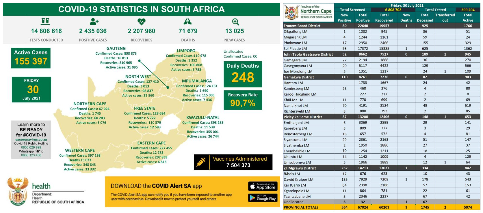 NORTHERN CAPE COVID-19 STATISTICS AS AT 30 JULY 2021