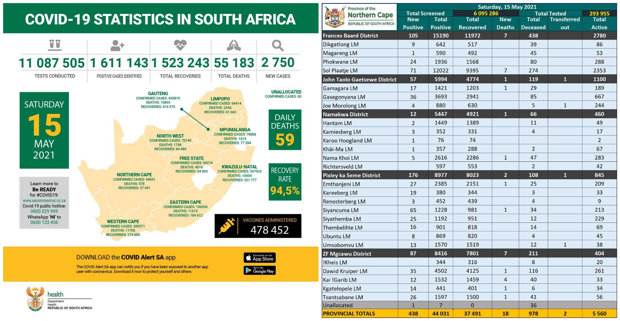 NORTHERN CAPE COVID-19 STATISTICS AS AT 15 May 2021