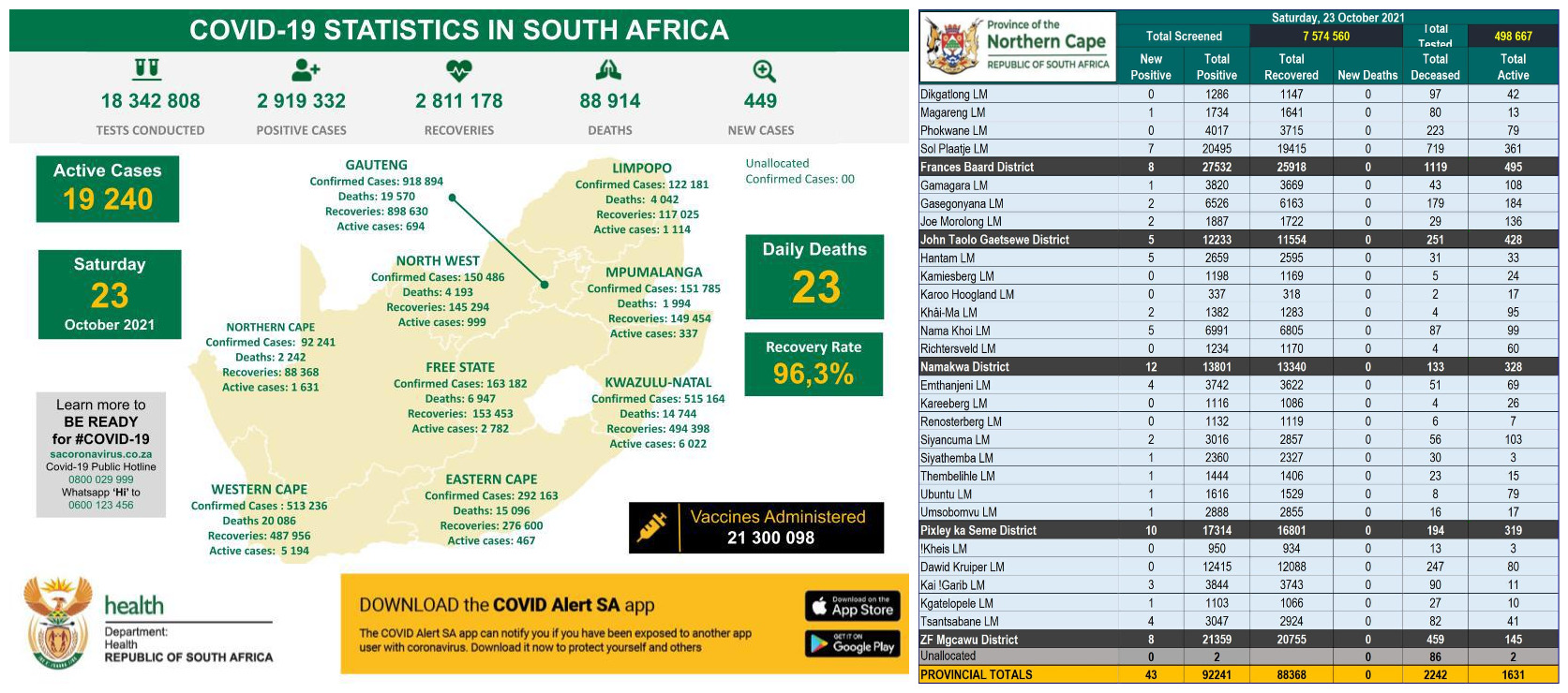 NORTHERN CAPE COVID-19 STATISTICS AS AT 23 OCTOBER 2021
