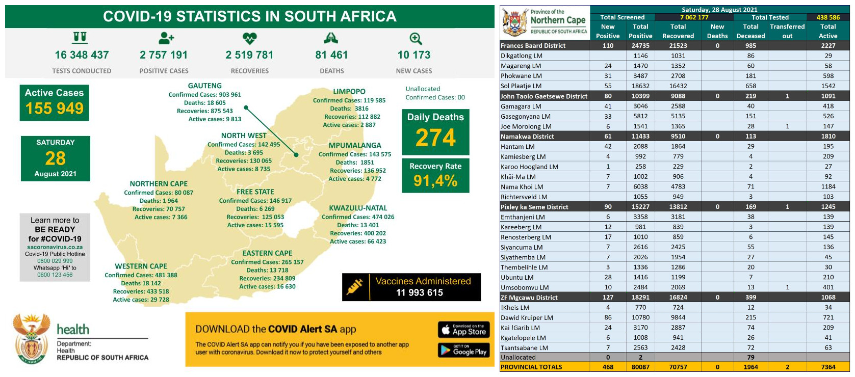 NORTHERN CAPE COVID-19 STATISTICS AS AT 28 AUG 2021