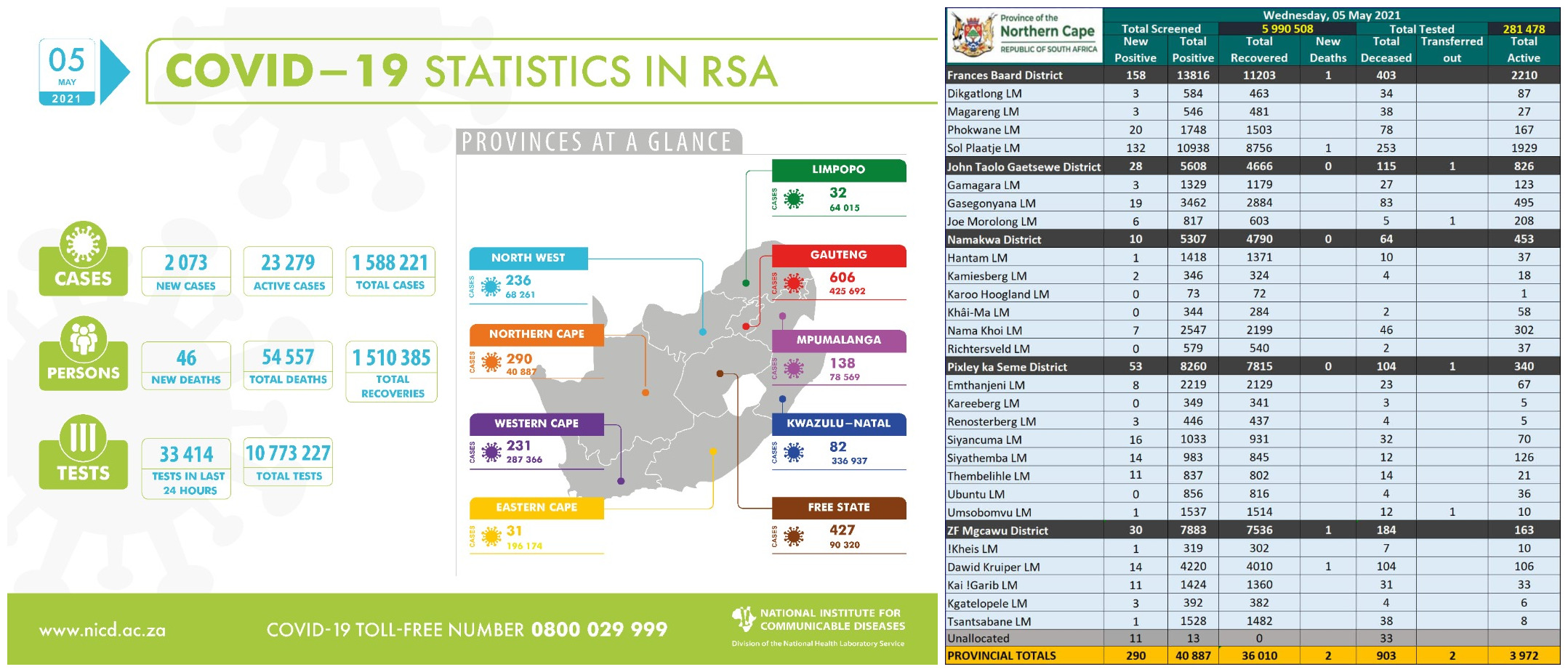 NORTHERN CAPE COVID-19 STATISTICS AS AT 05 May 2021