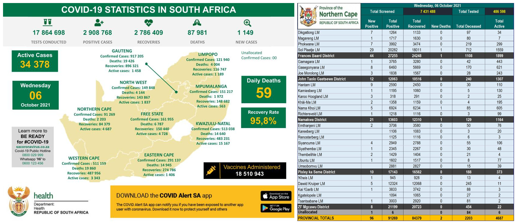 NORTHERN CAPE COVID-19 STATISTICS AS AT 06 OCTOBER 2021