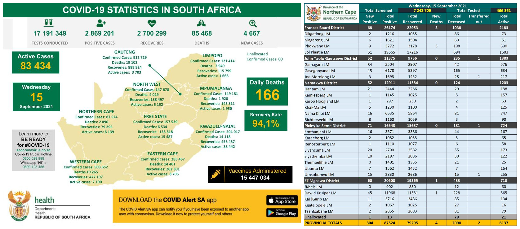 NORTHERN CAPE COVID-19 STATISTICS AS AT 15 SEP 2021