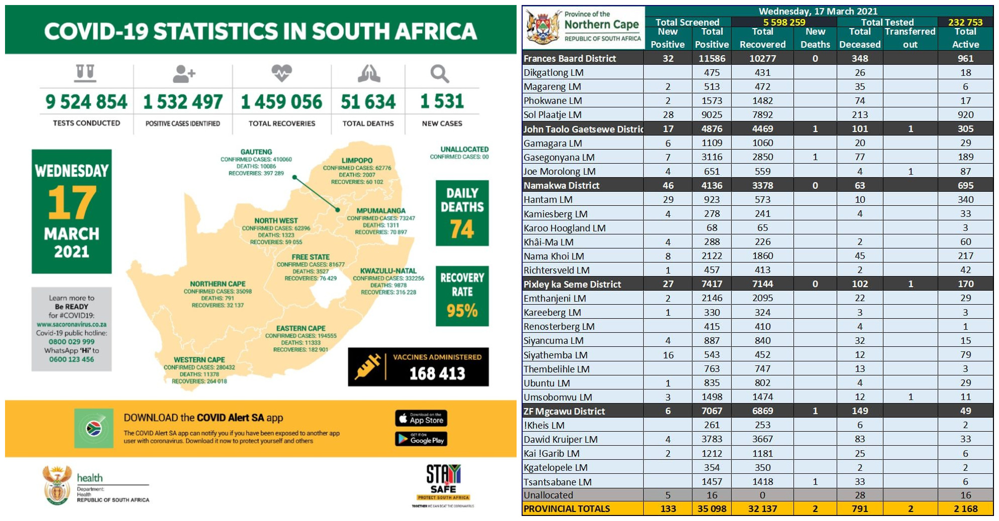 NORTHERN CAPE COVID-19 STATISTICS AS AT 17 MARCH 2021