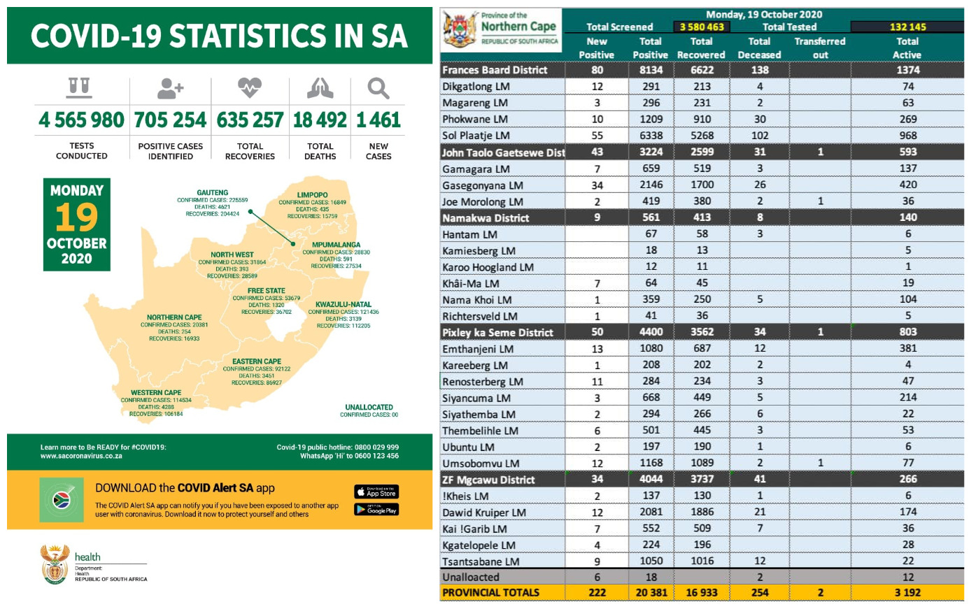 NORTHERN CAPE COVID-19 STATISTICS AS AT 19 OCTOBER 2020