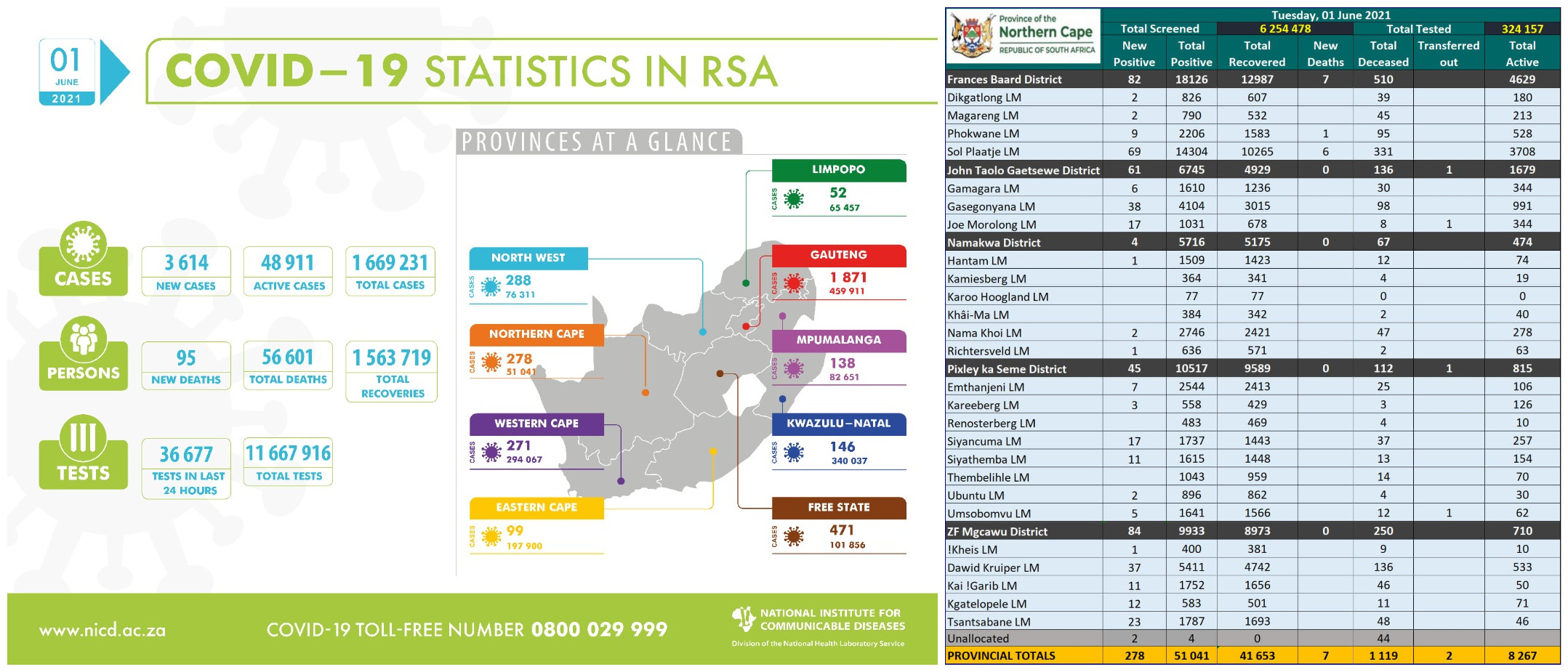As of today (01 June 2021), the cumulative number of COVID-19 cases identified in South Africa is 1 669 231 with 3 614 new cases reported.
