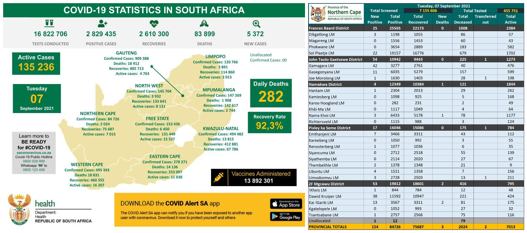 NORTHERN CAPE COVID-19 STATISTICS AS AT 07 SEP 2021