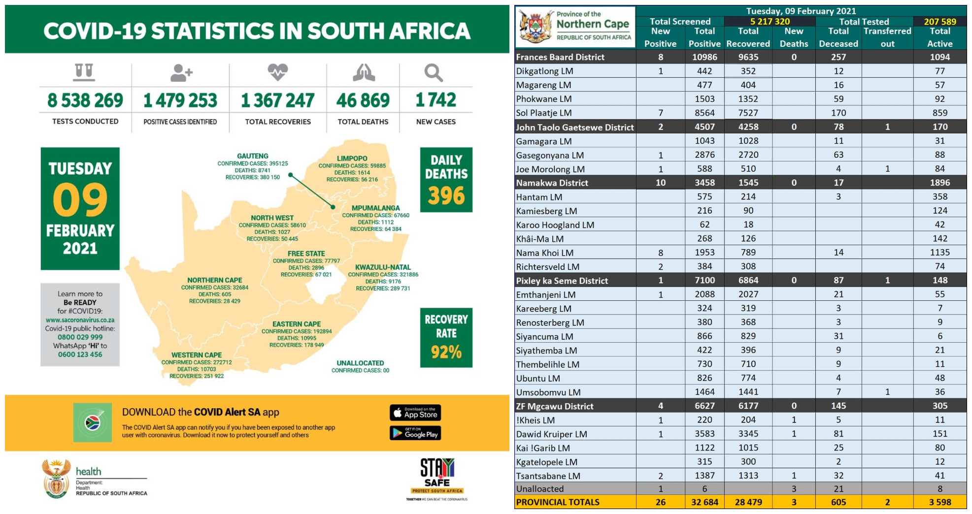 NORTHERN CAPE COVID-19 STATISTICS AS AT 09 FEBRUARY 2021