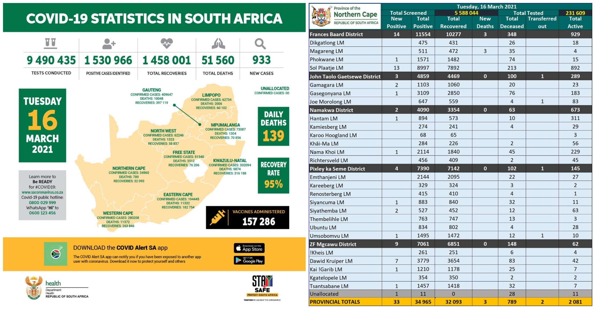 NORTHERN CAPE COVID-19 STATISTICS AS AT 16 MARCH 2021