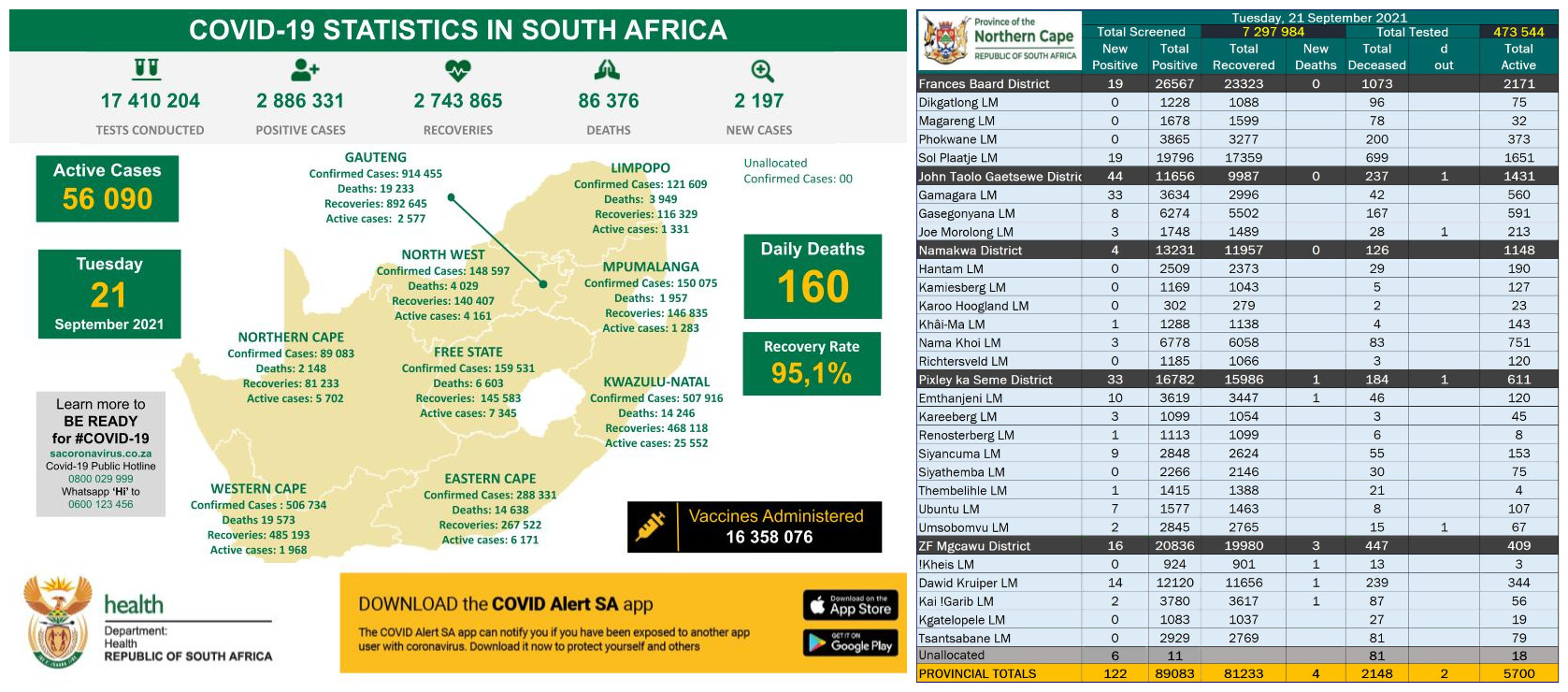 NORTHERN CAPE COVID-19 STATISTICS AS AT 21 SEP 2021