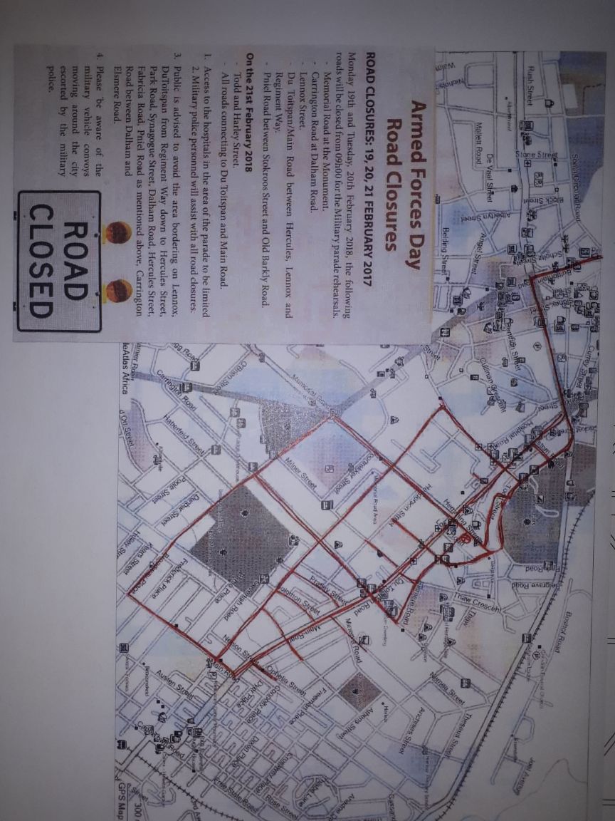 - The public is advised to avoid the area bordering on Lennox, DuToitspan from Regiment Way down to Hercules Street, Park Road, Synagogue Street, Dalham Road, Hercules Street, Fabricia Road, Pniel Road as mentioned above, Carrington Road between Dalham and Elsmere Road.