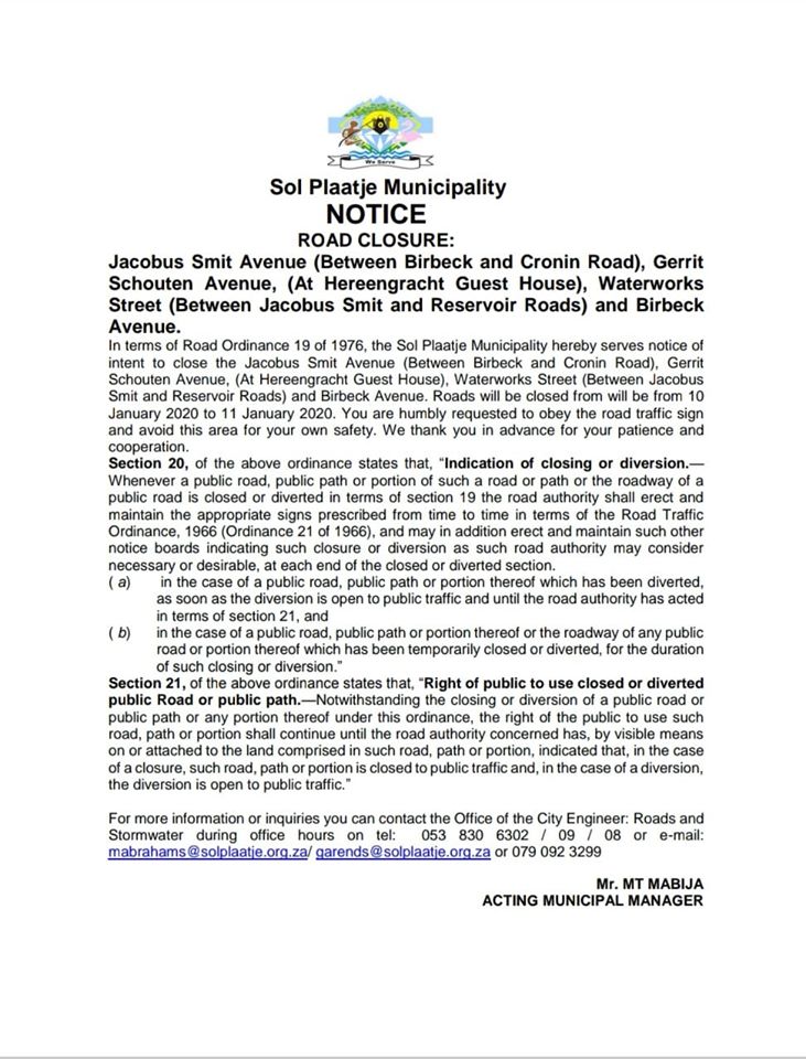 Sol Plaatje Municipality hereby serves notice of intent to close the Jacobus Smit Avenue (Between Birbeck and Cronin Road), Gerrit Schouten Avenue, (At Hereengracht Guest House), Waterworks Street (Between Jacobus Smit and Reservoir Roads) and Birbeck Avenue.