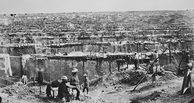 Pictured are three scenes of the New Rush (Big Hole/Kimberley Mine), the two depicting the camps being in 1871 and the diggings photograph from 1872.
