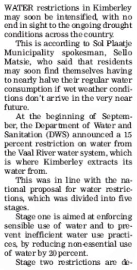 Water restrictions in Kimberley may soon be intensified, with no end in sight to the ongoing drought conditions across the country.
